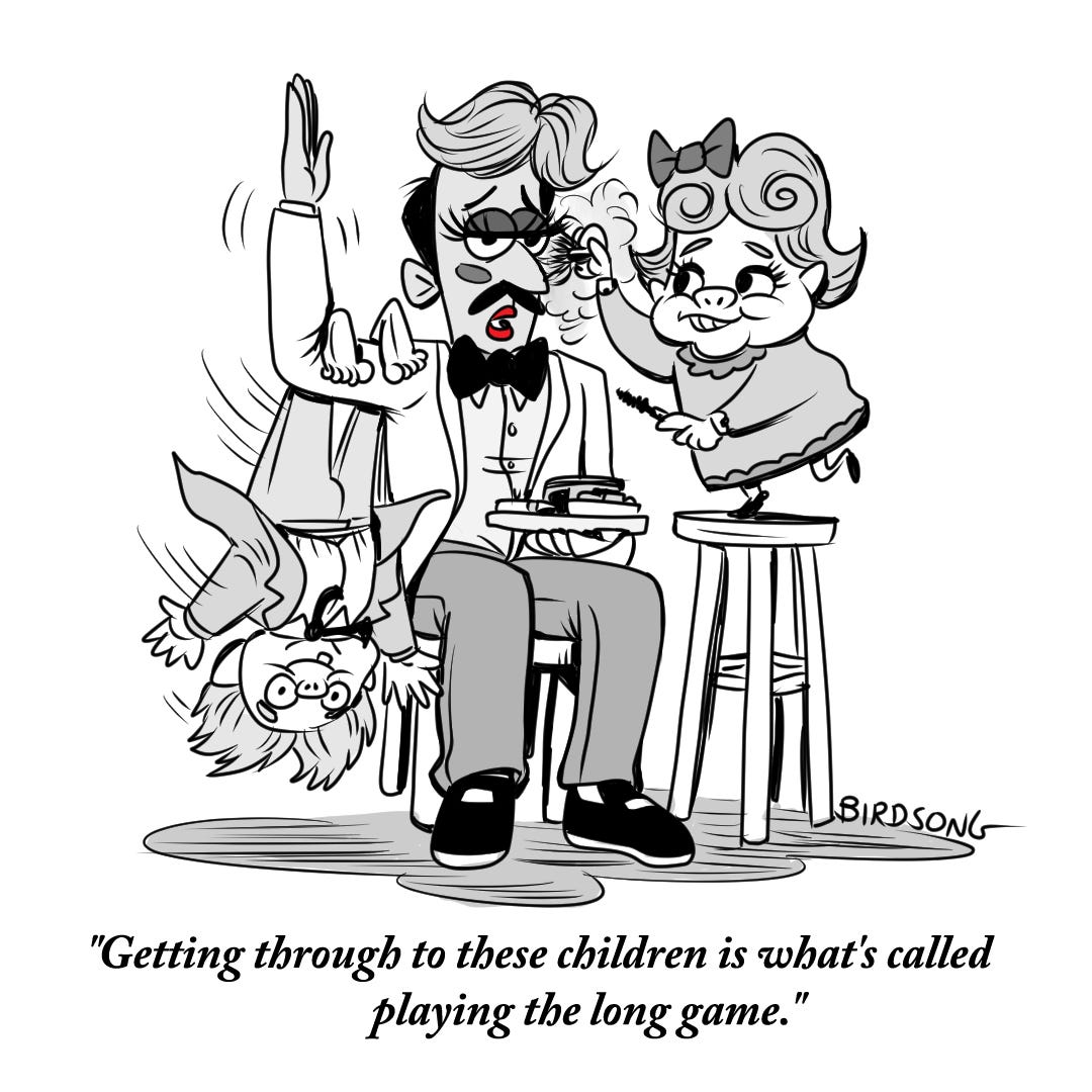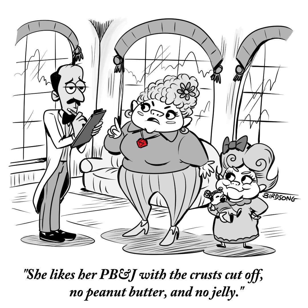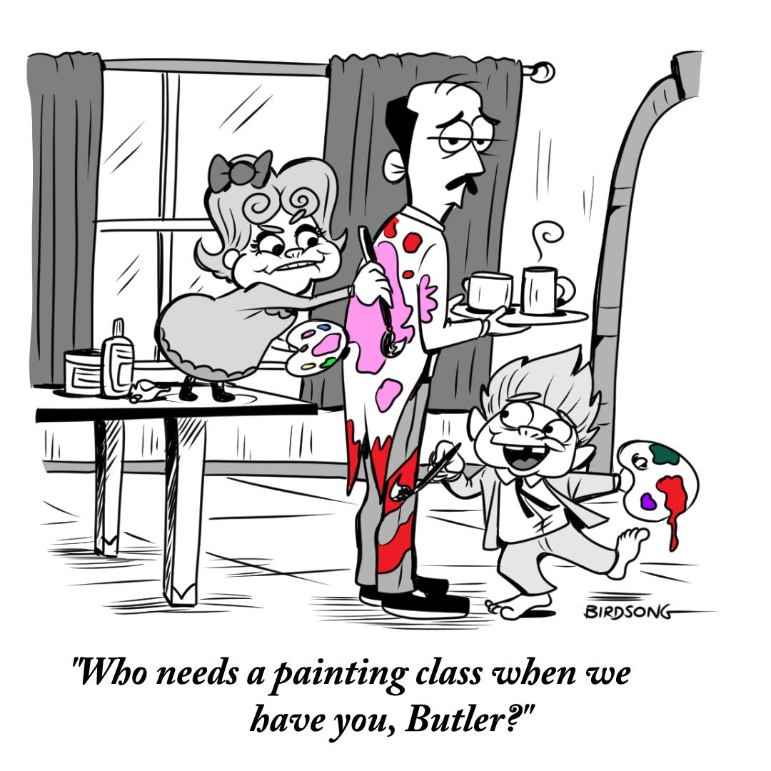 I started getting The Addams Family vibes, then made two more in which our service hero, The Butler, tries to keep it together while serving the family’s every whim.